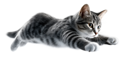 A playful gray tabby kitten with striking fur and bright eyes pouncing, ideal for pet products, animal welfare promotions, or childrens educational materials