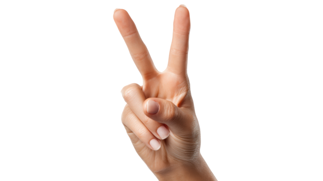 Hand forming a peace sign with fingers, isolated on white background.
