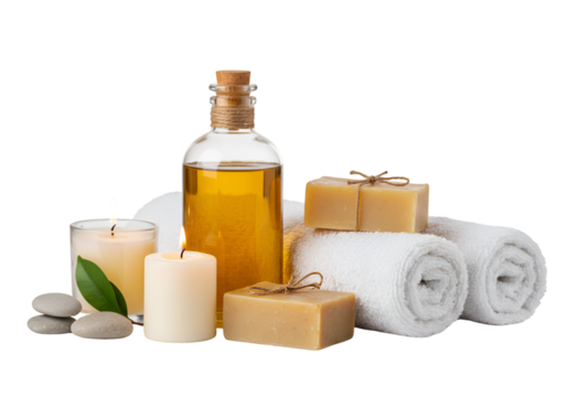 Isolated Spa Still Life with Candles Oil Soap and White Towels Png