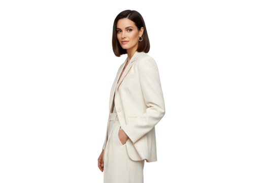 Woman in a cream suit with hand in pocket posing on transparent background