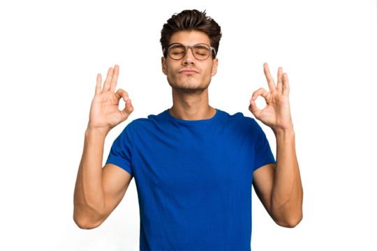 young woman in a blue shirt stretches with closed eyes, enjoying a moment of relaxation, demonstrating mindfulness and well-being against transparent background