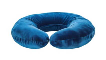Comfortable blue velvet travel pillow for neck support and relaxation on a transparent background Concept of travel accessories, comfort, and wellbeing