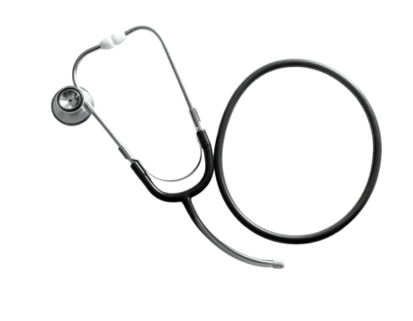 A detailed graphic of a stethoscope with a silver head, resting on a black background