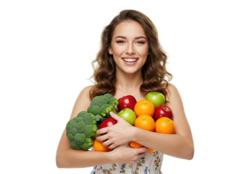 Smiling woman holding fresh fruits and vegetables isolated, healthy eating concept with broccoli, oranges, and apples for nutrition and wellness