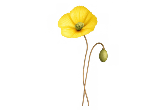 Yellow welsh poppy flower and bud growing on stem, botanical element with vibrant petals, transparent background