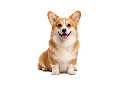 Cute Pembroke Welsh Corgi dog sitting and smiling, full body view isolated on a white background. Adorable short-legged companion pet with fluffy fur, happy expression, and friendly personality
