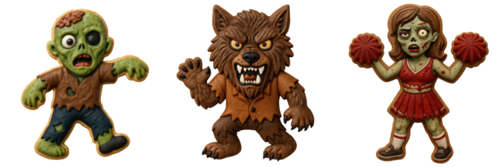 Monster lineup set — zombie, werewolf and zombie cheerleader cutouts. Perfect snacks for spooky occasions