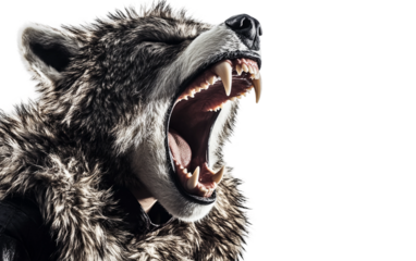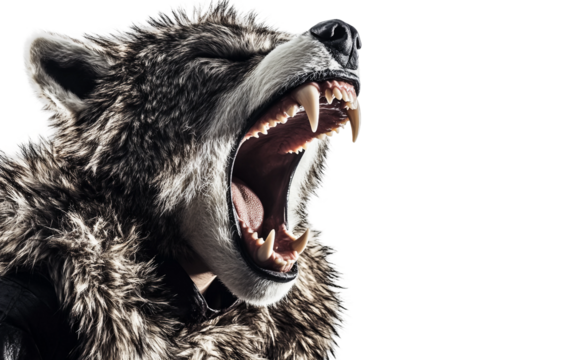 Fierce werewolf monster creature with sharp teeth isolated on transparent background. Menacing werewolf lunges forward isolated on white background.