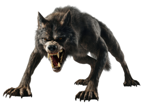Fierce werewolf with sharp teeth and claws isolated on transparent background, ready to attack in the night