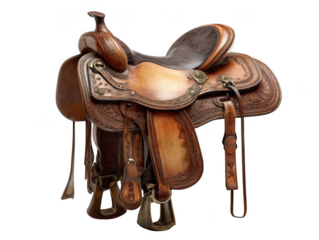 Ornate western leather saddle isolated on transparent background