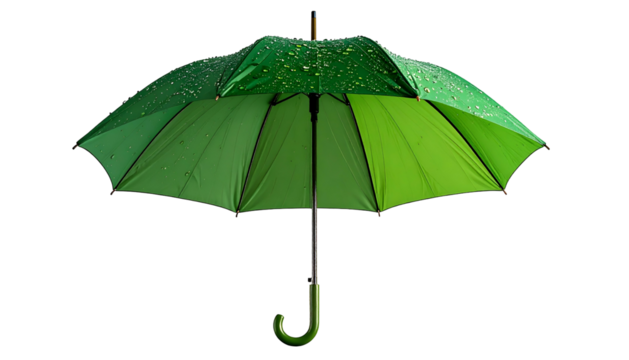 Bright green umbrella, open against a black background. Raindrops visible
