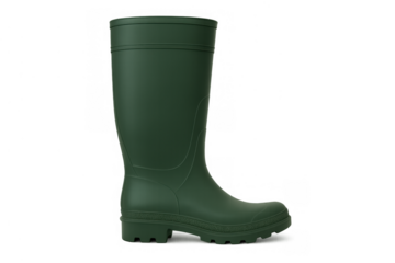 Green rubber rain boot, waterproof footwear for gardening, muddy conditions, outdoor work, or walking in wet weather