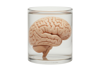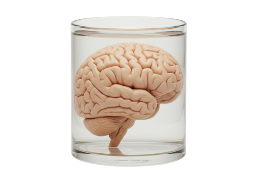 Isolated Anatomical Brain Floating in Clear Jar Full of Water Inside Study or Research Lab