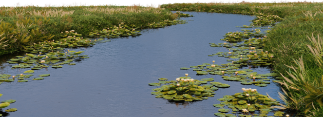PNG of Serene wetland landscape with lush greenery and reflections in calm water, creating a tranquil natural habitat.