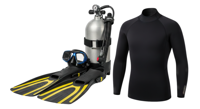 Scuba Diving Gear: Tank Mask Fins and Wetsuit Top.