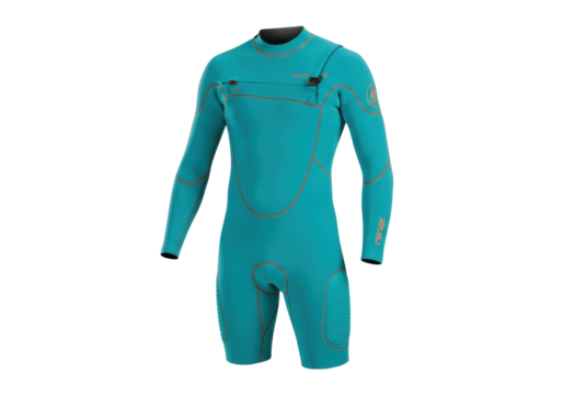 Isolated teal wetsuit for surfing and water sports, technical clothing in studio shot