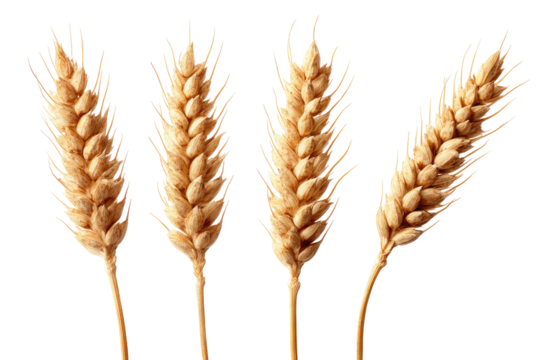 Four wheat stalks, light golden color, close-up view against black background