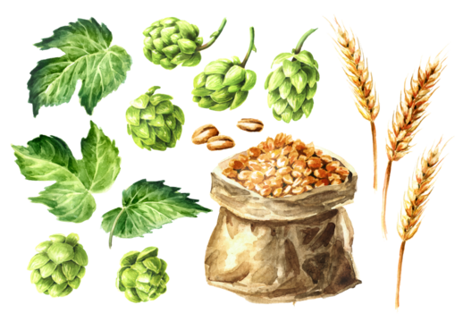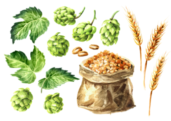 Fresh green hops (Humulus lupulus) and ears of wheat and barley set. Hand drawn watercolor illustration isolated on white background
