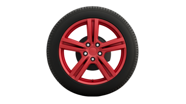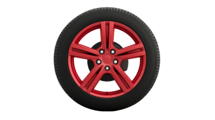 Red alloy wheel with black tire on clear background