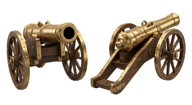 Historical brass cannons with wooden wheels isolated on transparent background for museum or