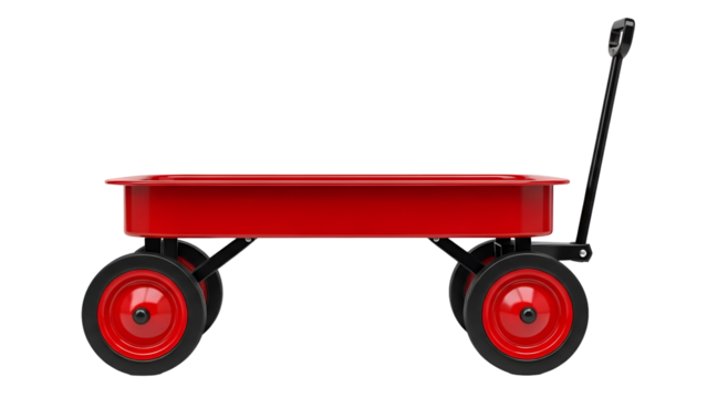 Red metal wagon with black handle and wheels