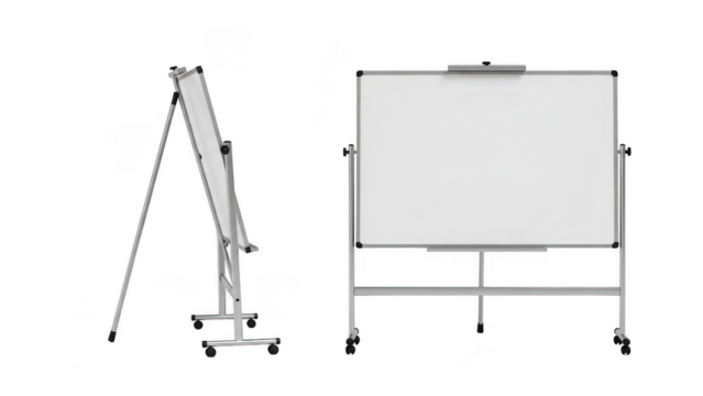 Mobile whiteboard on stand with adjustable height and wheels for presentations and educational use isolated on transparent background