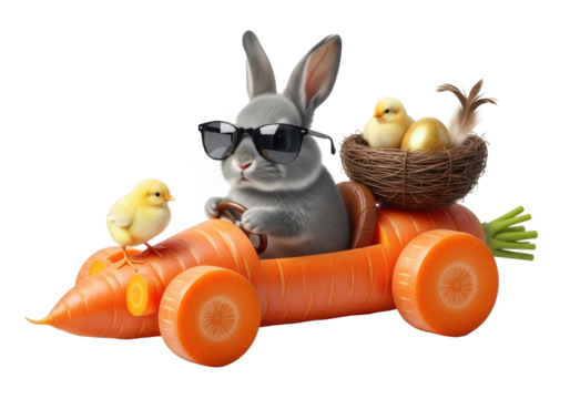 Cute bunny rabbit driving a red toy car isolated PNG with Transparent Background