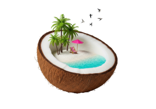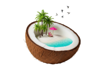 Red and white striped deck chair with wooden frame, placed on red boat shaped base, isolated on transparency background, evokes playful and relaxing summer vibe