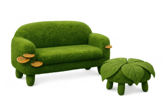 Whimsical moss sofa with oyster mushrooms and a leaf covered ottoman for fantasy or nature-inspired decor design