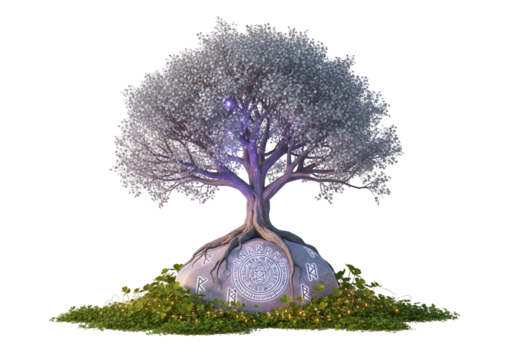 Whimsical floral lamp with glowing patterns and leafy decorations in blue vase resting on grass isolated on white background