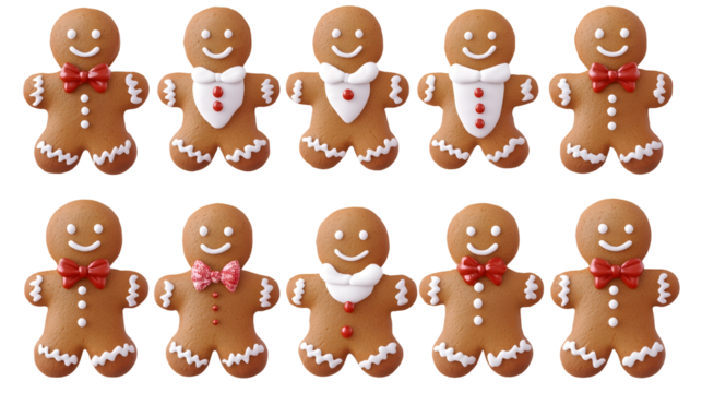 Festive set of gingerbread Christmas men with hand decorated icing smiles bow ties and sugar coated details isolated on a transparent background