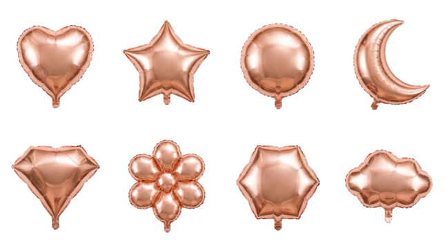 Rose gold balloon set including heart, star, moon, circle, diamond, flower, and cloud shapes isolated. Party and celebration decoration collection.