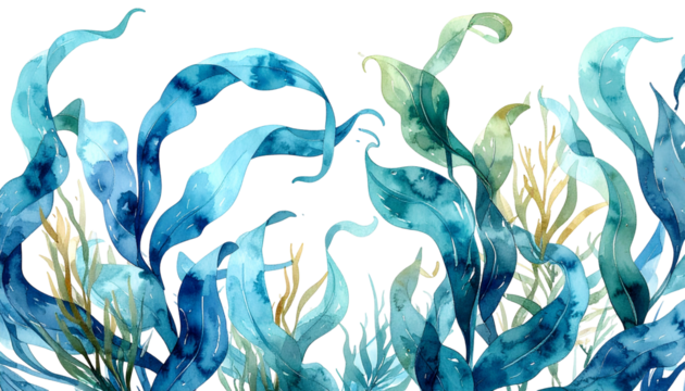 Watercolor depiction of aquatic plants, with flowing blue-green leaves