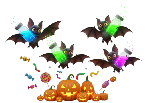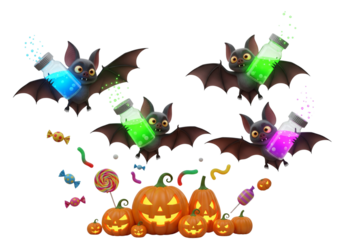 Cute Halloween Bats Flying with Magic Potions over Glowing Pumpkins and Candy