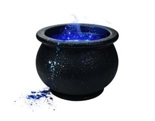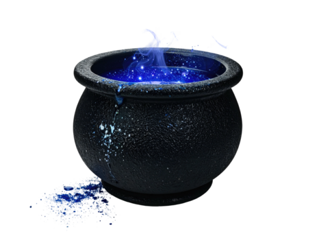 A dark cauldron with swirling blue potion and steam, set against a black background