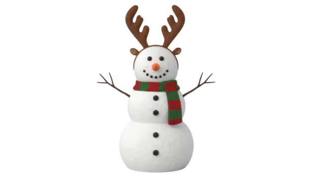Cute Snowman Character Wearing Reindeer Antlers Headband and Striped Christmas Scarf Illustration isolated on Transparent Background