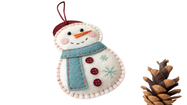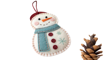 Charming handmade felt snowman ornament hangs next to a natural brown pine cone decoration on transparent background
