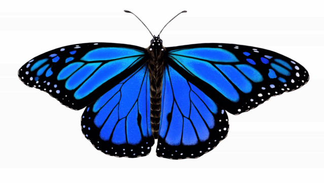 Brilliant blue butterfly with open wings on clean white background, rich azure gradient and dotted black border, elegant fantasy insect illustration ideal for ocean, sky, trust and creative nature des