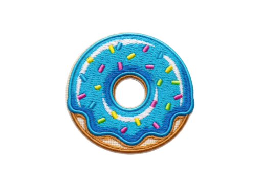 Detailed macro of an embroidered donut fabric patch with bright blue satin stitching and neon pop-art sprinkles, isolated on a white background with copy space. Concept of playful textile craft