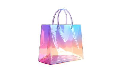 Iridescent pastel shopping bag, translucent with a curved top handle, displaying a gradient of pink, blue, and purple hues