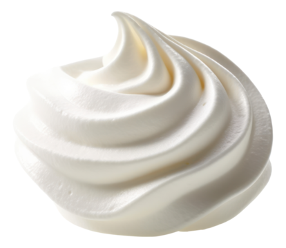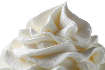 Close-up of a beautifully swirled dollop of white whipped cream, isolated on a white background.