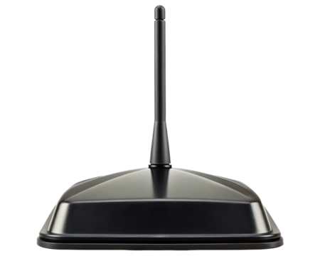 Modern black automotive roof mount whip antenna for radio signal on a transparent background