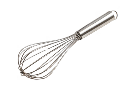 Stainless steel whisk with a sleek handle, perfect for beating eggs and mixing ingredients in the kitchen. Isolated on transparent background