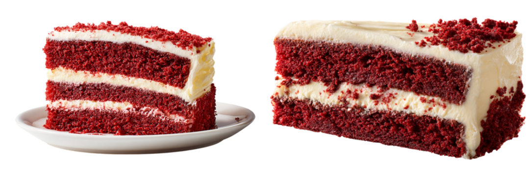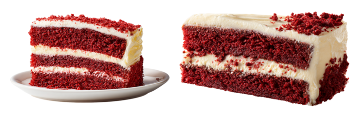 Two slices of red velvet cake on a plate and one cut in half isolated on transparent background