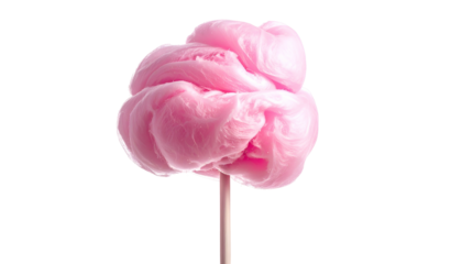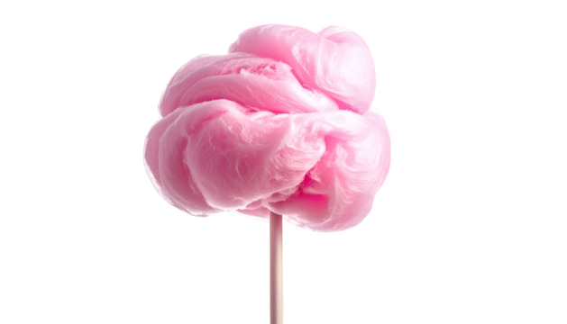 Fluffy pink spun-sugar treat on a wooden stick against a black background