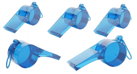 A close-up shot shows a blue plastic whistle with its details against a dark background
