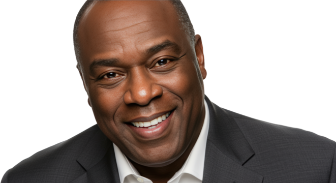 Smiling senior black man in suit and white shirt, professional portrait for business and finance Isolated On Transparent Background