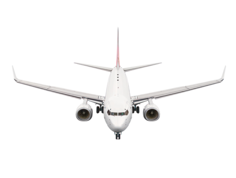 A white airplane flying, isolated on a transparent background