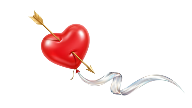Red heart pierced by arrow with ribbon isolated on transparent background
