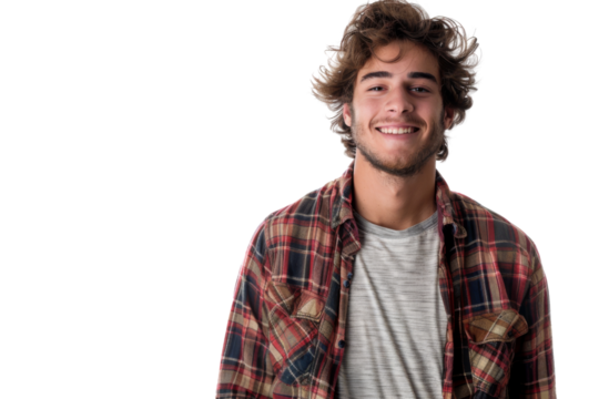 Smiling young man in casual attire, hands in pockets, isolated on white background